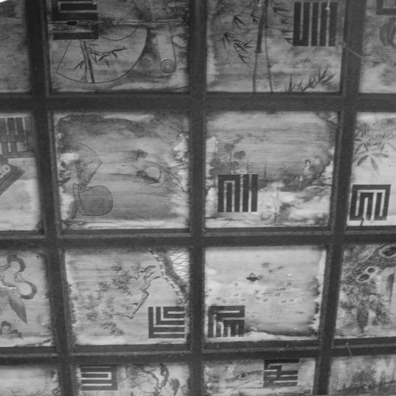 朱は堂内にも及び、格天井の繊細な絵には独特な源氏香図が描き込まれている。内陣に並ぶ三十三観音や古色然とした菩薩像。