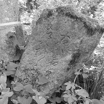 ひと休みの後、石像を辿って更に上へ進むと、すぐ地理院地図の点線に繋がった。こちらの山道も手入れしてあるが、林道との分岐には小さな追分石しか目印が無い。林道を少し下ると、寛政十三年の観世音菩薩碑が立っていた...