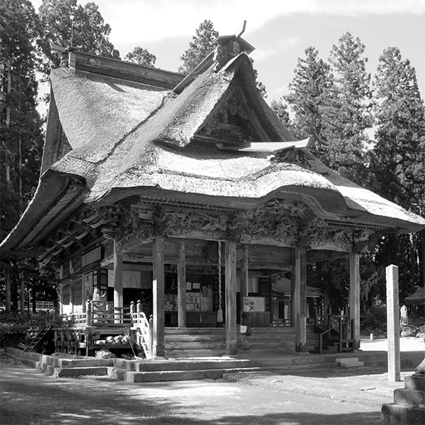 千鳥破風を正面に据えた屋根は、重厚な萱葺きで威厳を弥増す。一々張り出す尾垂木もまた勇ましい。御裏に羽黒大権現